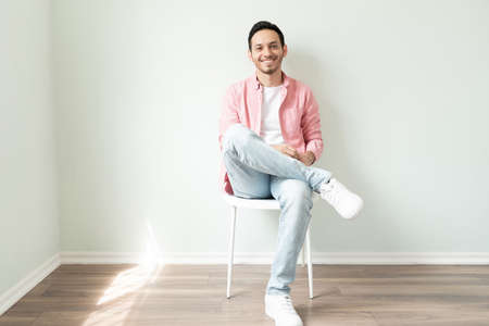 Full length portrait of an attractive young Hispanic man sitting on a chair and looking relaxed