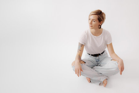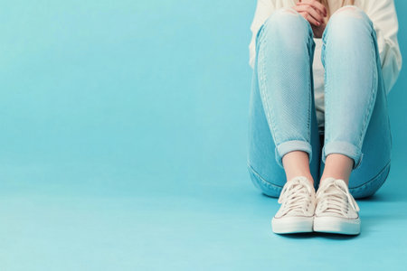 In a minimalistic setting with a soft blue backdrop a young person sits comfortably on the floor dressed in light jeans and a casual top. Their hands are clasped around their knees suggesting introspection or contemplation