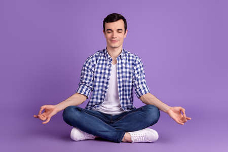 Full body photo of young guy sit floor yoga meditation om dream isolated over violet color background