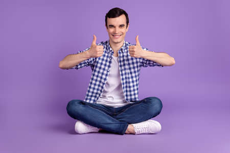 Full size photo of young cheerful man sit floor show thumbs-up approve isolated over violet color background