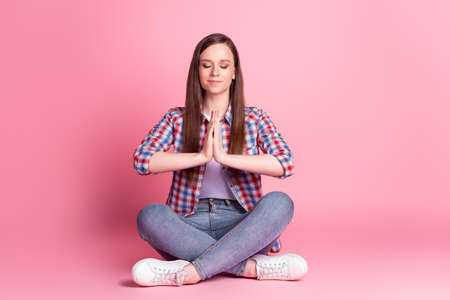 Full size photo of young pretty woman arms together meditate om practice isolated over pink color background