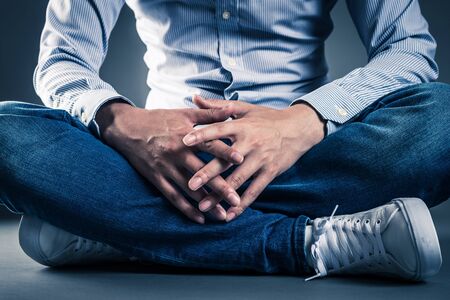 Handsome man sitting relax on floor against copy space for adding text with white wall background