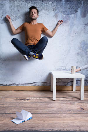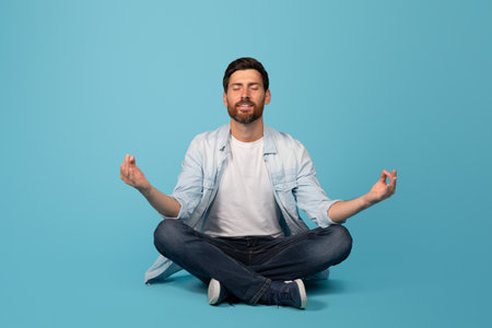 Happy calm young european bearded guy in casual meditates with closed eyes, sits on floor in lotus position