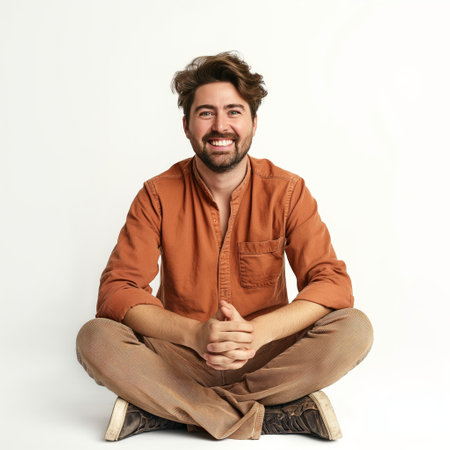 Joyful young adult male with beard and tousled hair, wearing casual earth-toned clothes, sitting with crossed legs, white background.