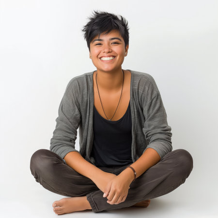 A relaxed young adult with short hair and casual clothing sits cross-legged, radiating happiness with a bright smile.