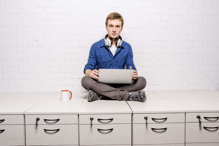 Handsome young man in white headphones sitting with coffee cup on chest of drawers and holding laptop against white brick wall background