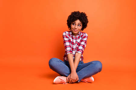 Photo attractive amazing beautiful lady sit floor lovely look empty space wear specs casual jeans denim checkered plaid shirt sneakers isolated orange background