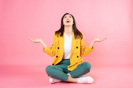 Dreaming in Serenity: Beautiful Woman Seated Comfortably in Lotus Position, Gazing into Empty Space, Yearning for a New Love - Tranquil Mood on Pink Background