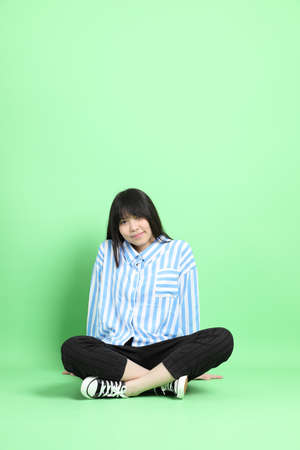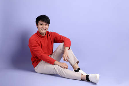 The young adult southeast Asian man with red long sleeve shirt sitting on the purple background.