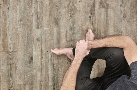 frustrated bearded man sitting on the floor and holding hands behind his head