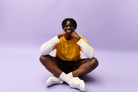 A young man with a bright smile sits cross legged on a soft pastel surface, embracing casual style.