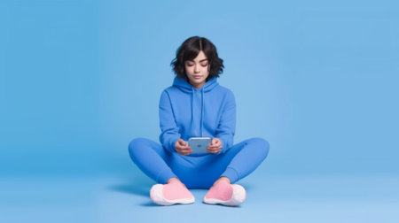 Generative AI : Full length delighted little girl in casual clothes and headphones smiling for camera and listening to music while sitting crossed legged and using tablet on blue b