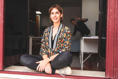 Happy creative freelance Asian man sitting on the floor smile and looking out.