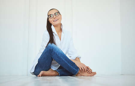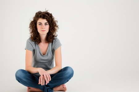 Sublime Simplicity: The Woman in White Shirt and Blue Denim Jeans, Serenely Seated on a Brown Carpet