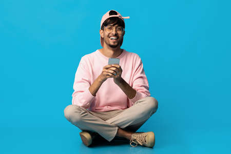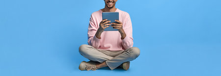 Man Sitting on Floor Using Tablet, Smiling Happily Against a Blue Background