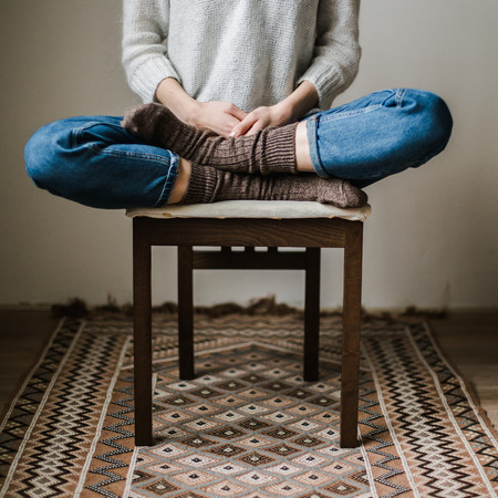 Feet in woollen socks. Woman is relaxing with a cup of hot drink and warming up her feet in woollen socks.