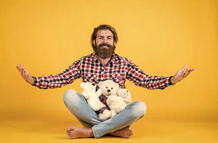 welcome. happy valentines day. cheerful bearded man hold teddy bear. male feel playful with bear. brutal mature hipster man play with toy. happy birthday. being in good mood