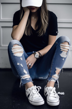 a cropped shot of a woman wearing ripped up jeans in a hat