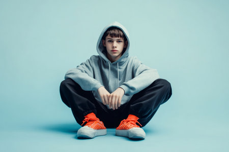 Serious young boy in a gray hoodie, black sweatpants, and orange sneakers, sitting on a light blue background, representing youth