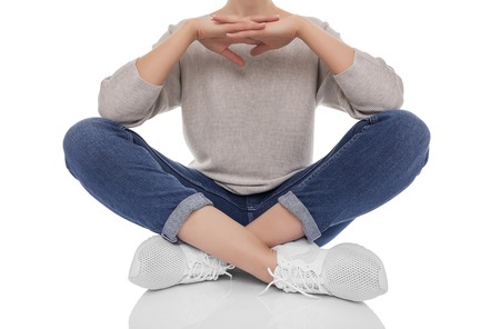 Youth hipster concept. Female legs in jeans and sneakers sitting on white background with cruiser board.