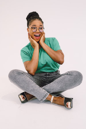 African woman smiling and sitting on the ground in green shirt. Happy black girl with beautiful expression
