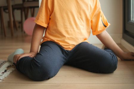 African boy in everyday clothes sitting on a floor with crossed legs over wall background