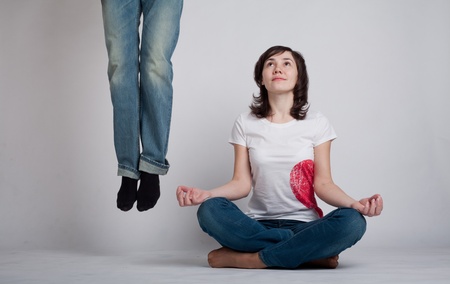 Close-up of portrait of yoga trainer girl sitting in lotus position on a white background next to a green flower