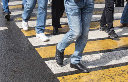 legs of pedestrians walking on the crosswalk in the city on summer day