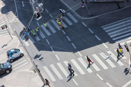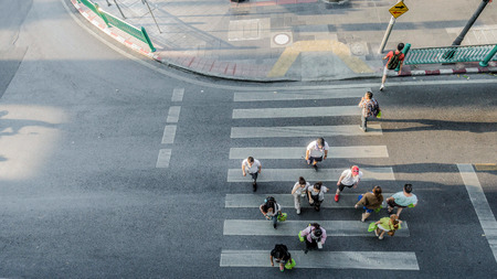 Blur people are moving across the pedestrian crosswalk in the city road (on top view)
