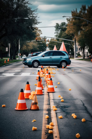 car accident scene with police tape and traffic cones, created with generative ai
