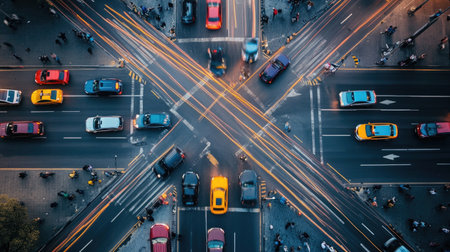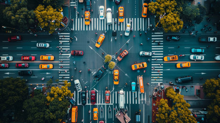 Overhead shot of a bustling city crosswalk with yellow taxis and pedestrians, capturing the vibrant urban life during rush hour. Resplendent.
