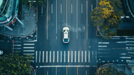 The following is a top-down aerial view of an autonomous self-driving car as it moves through a city highway. AI Visualization Concept: Sensors scanning the road ahead for vehicles and safety hazards