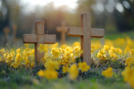 A serene easter scene features a wooden cross in a meadow at sunrise. surrounded by colorful wildflowers and bathed in golden light, it evokes a spiritual and calming atmosphere perfect for meditation and reflection.
