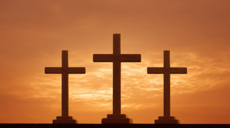 Three wooden crosses stand silhouetted against a vibrant sunset sky, evoking a sense of faith and tranquility. The warm colors create a serene atmosphere perfect for reflection.