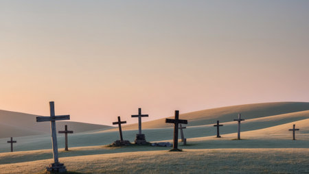 AI Generated. Tranquil Landscape with Wooden Crosses at Sunrise