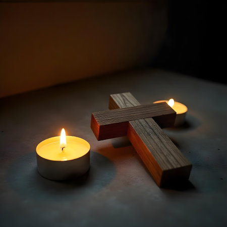 Wooden cross with burning candles on a dark background. Religion concept.