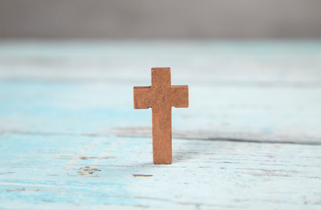 wooden cross on the blue wooden table