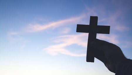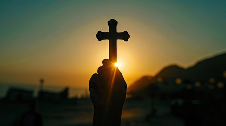 Silhouette of a cross lifted by a hand with the rising sun in the background, highlighting a moment of spiritual devotion with this inviting photo.