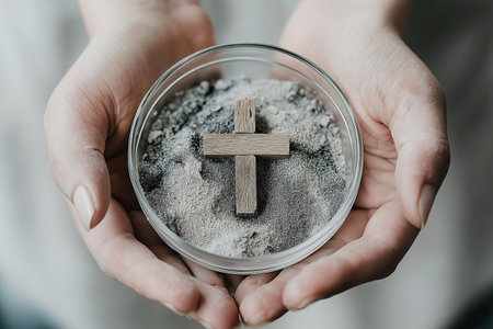 Hands holding ashes with wooden cross symbolizing faith and reflection. Ash Wednesday