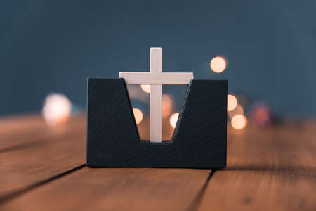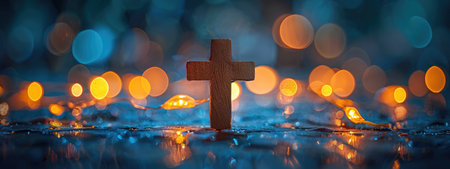 Christian cross on blue background with soft bokeh lights background. Copy space. Banner. Church worship, salvation concept. Faith symbol in Jesus Christ. Holy cross for good friday, Easter day