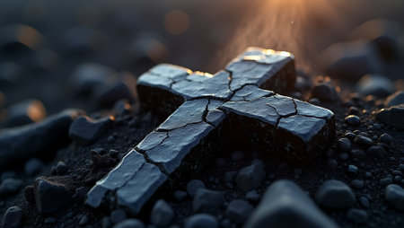 Dark cross on textured ground, dramatic light and shadow.