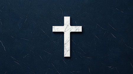White cross symbol on navy blue background, bold and refined religious design.