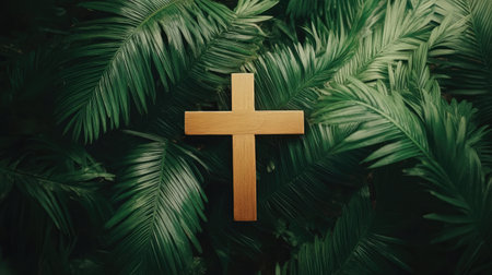 An overhead shot of a simple wooden cross paired with palm leaves, representing the essence of Palm Sunday.