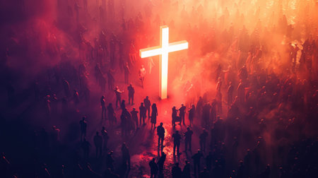 Faith and hope depicted with a glowing cross and crowd of people silhouettes, creating a powerful and inspirational image