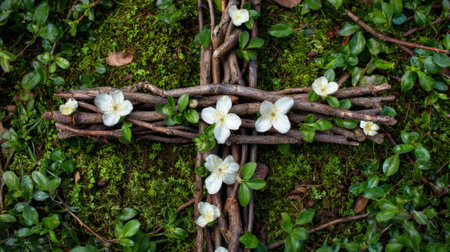 Concept photo of a cross made of natural twigs and branches, adorned with delicate white flowers and surrounded by vibrant greenery, symbolizing the beauty and simplicity of faith