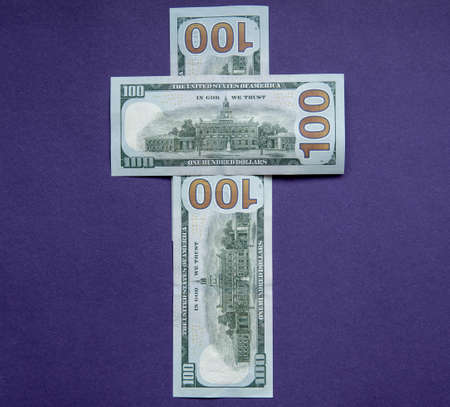 cross folded from one hundred dollar bills on a purple background. concept church and money.