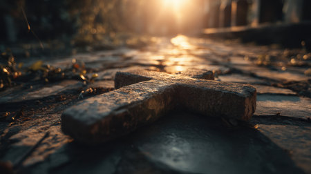 A weathered stone cross rests on a cobblestone path, illuminated by golden hour sunlight. It evokes a sense of peace and reflection in a serene cemetery setting.