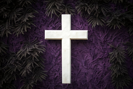 A stunning white cross set against a rich purple background, accented by dark green ferns, showcasing a blend of elegance and spirituality in a serene composition.