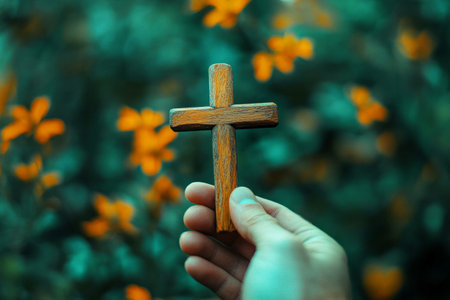 A wooden cross held gently in a hand, set against a blurred green and orange background, symbolizing faith and hope in a peaceful, spiritual atmosphere