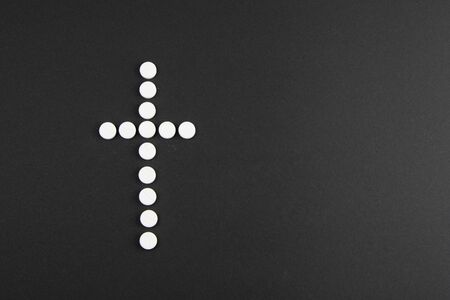 White pills laid out in the shape of a cross on a black background. copy space for text.